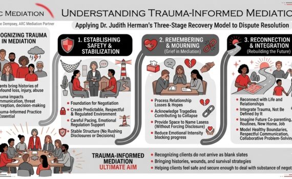 By Shane Dempsey , ARC Mediation Partner I read reading an article by Dispute Resolution expert and researcher Inès Khalifa about Trauma Informed Mediation & the Psychological Aftermath. The discussion surrounding the article was fascinating and prompted me to reflection on how my attitude to trauma in mediation has shifted […]
